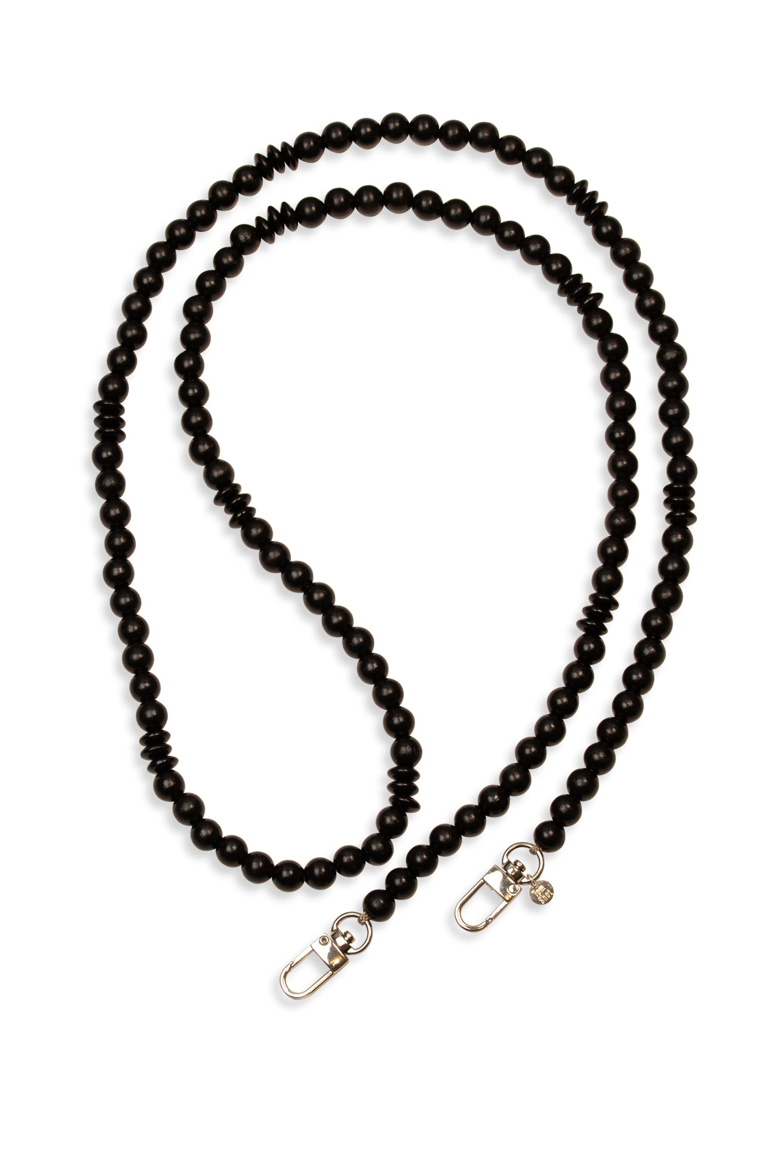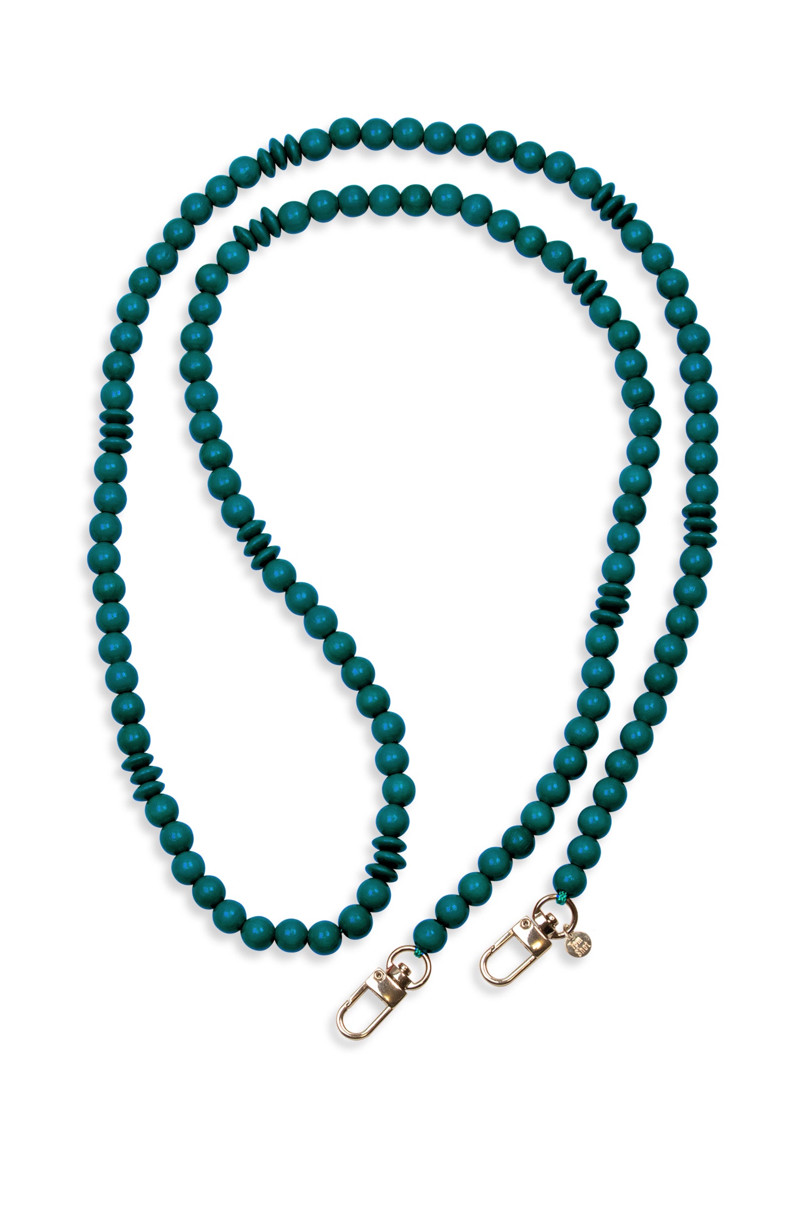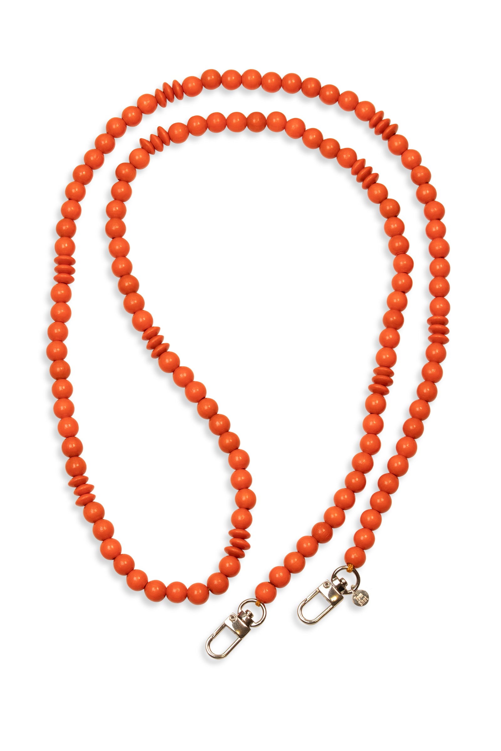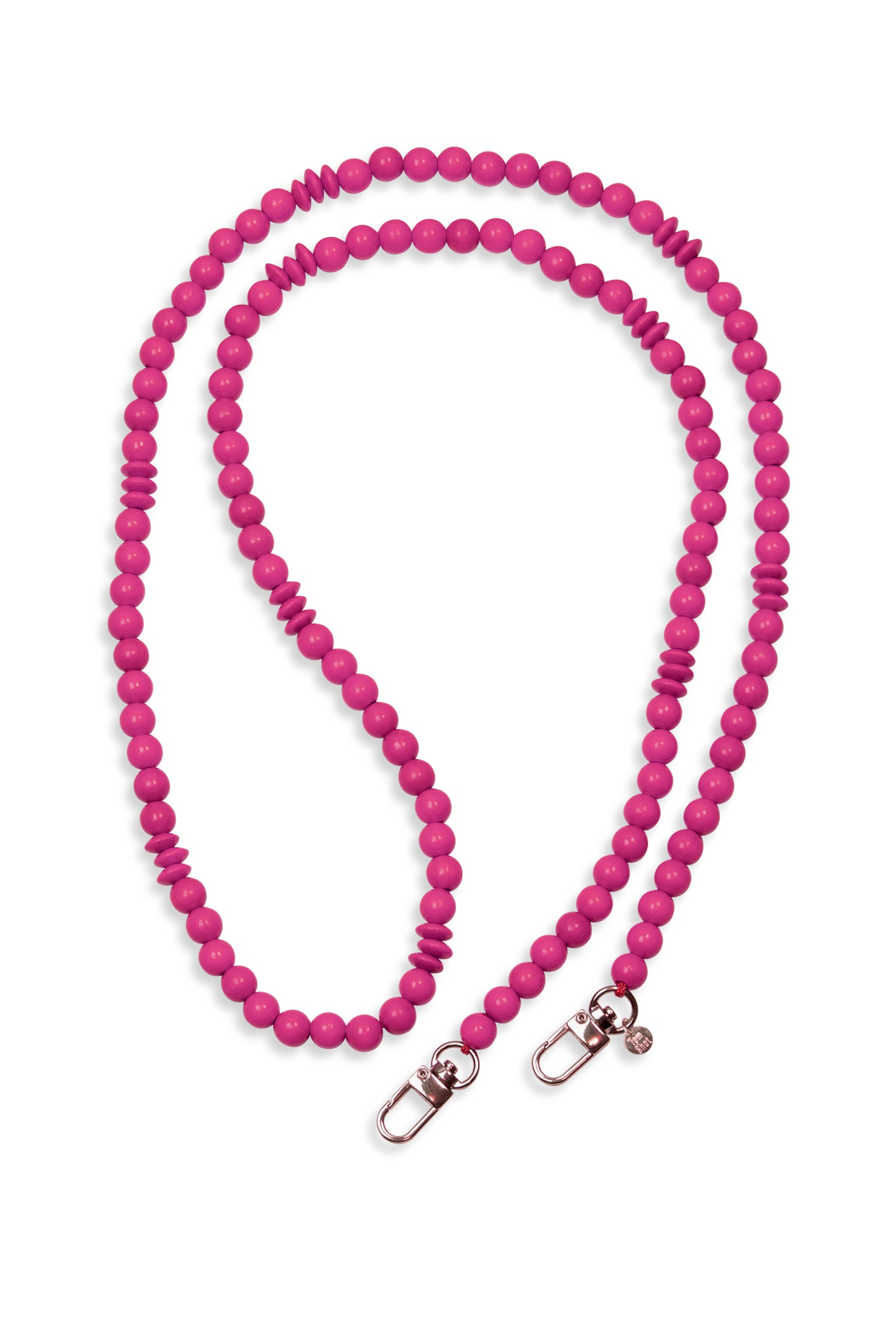 Diese Handykette hat eine Gesamtlänge von 130 cm, die Holzperlen haben wir auf eine stabile Schnur aufgefädelt und an den Enden Karabinerhaken befestigt.