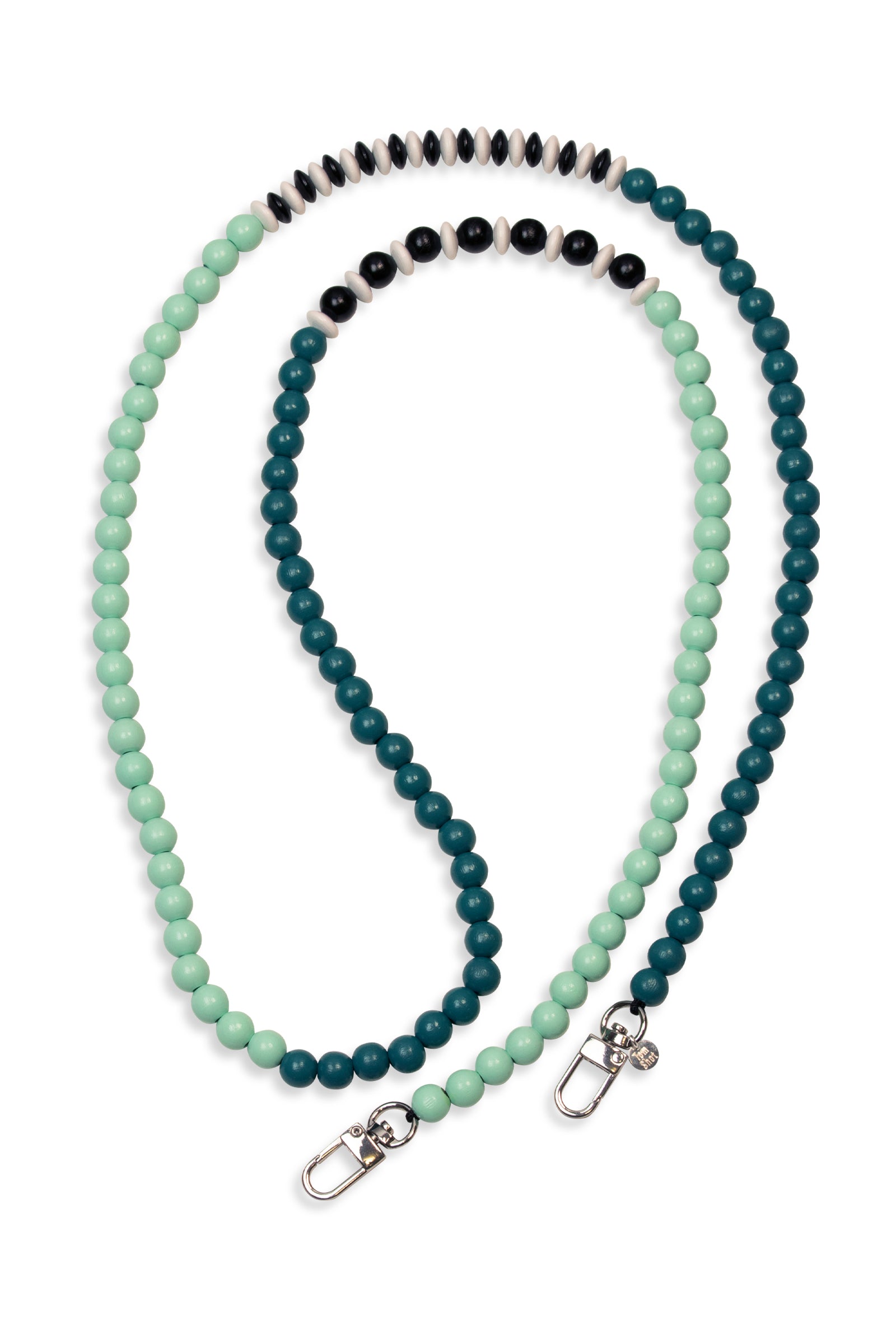 Diese Handykette hat eine Gesamtlänge von 130 cm, die Holzperlen haben wir auf eine stabile Schnur aufgefädelt und an den Enden Karabinerhaken befestigt.