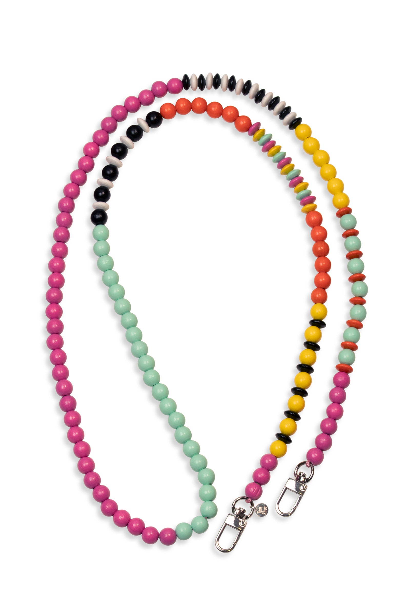Diese Handykette hat eine Gesamtlänge von 130 cm, die Holzperlen haben wir auf eine stabile Schnur aufgefädelt und an den Enden Karabinerhaken befestigt.