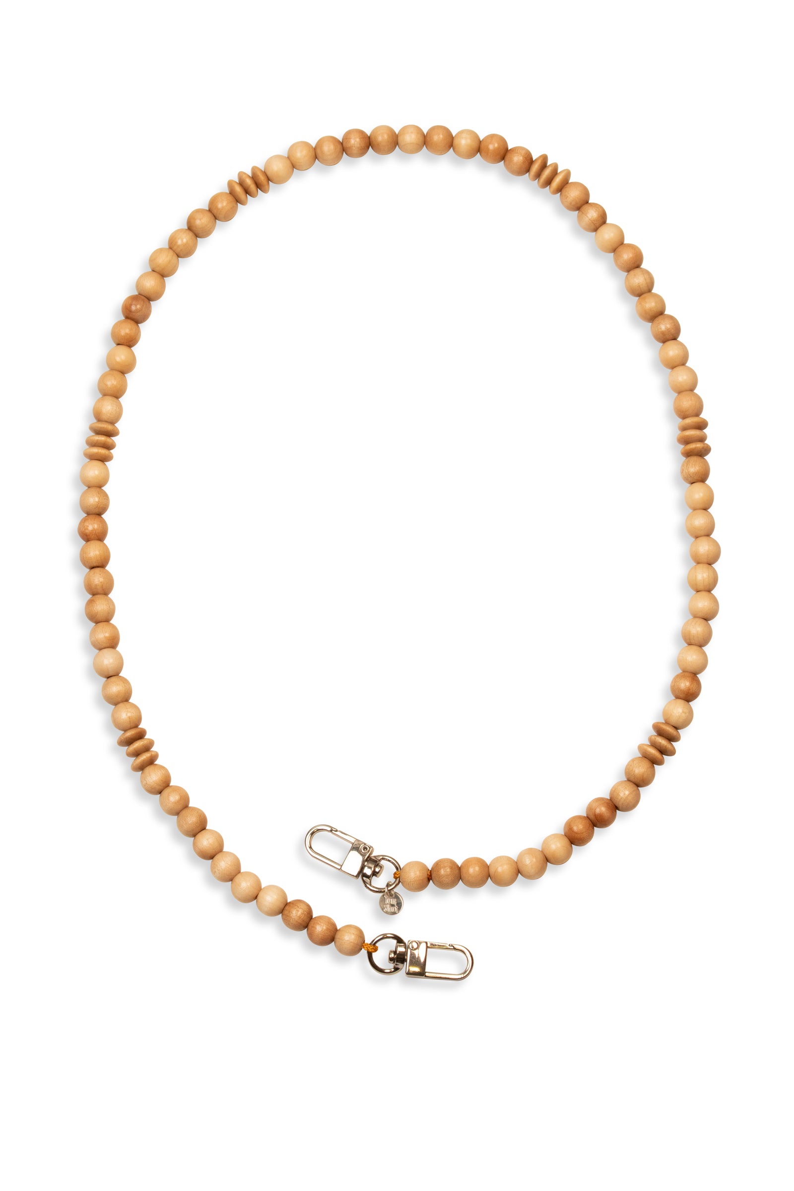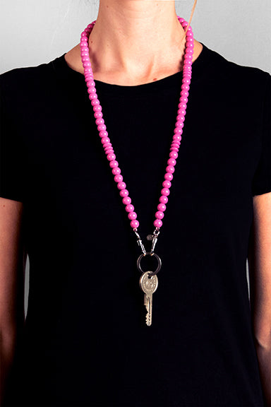 Diese Schlüsselkette hat eine Gesamtlänge von 80 cm, die Holzperlen haben wir auf eine stabile Schnur aufgefädelt und an den Enden Karabinerhaken befestigt.