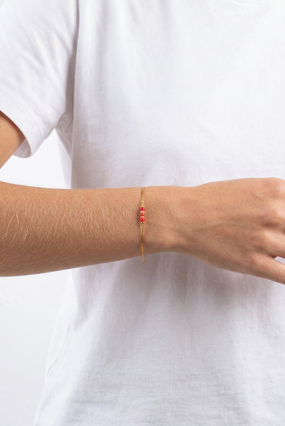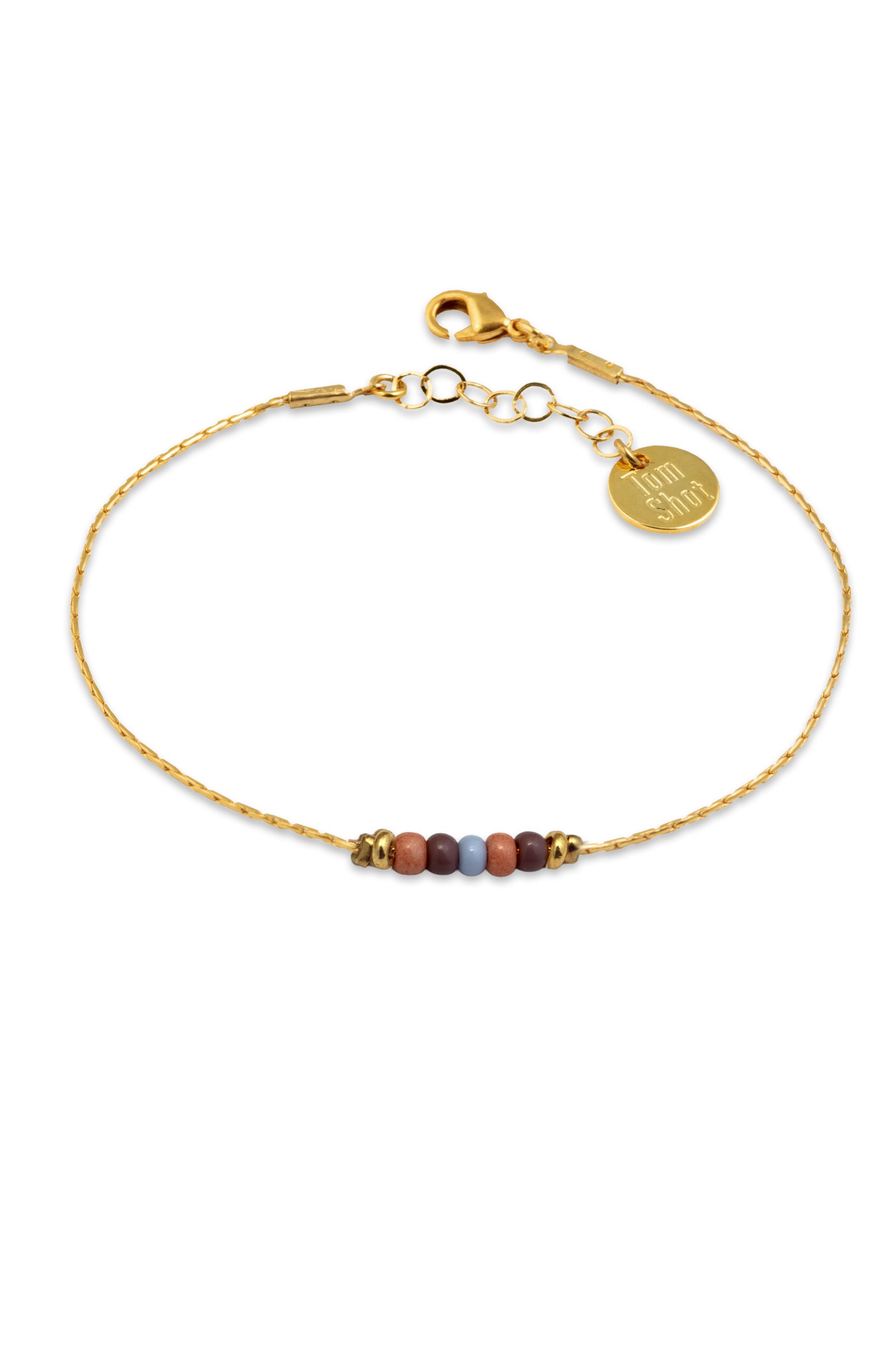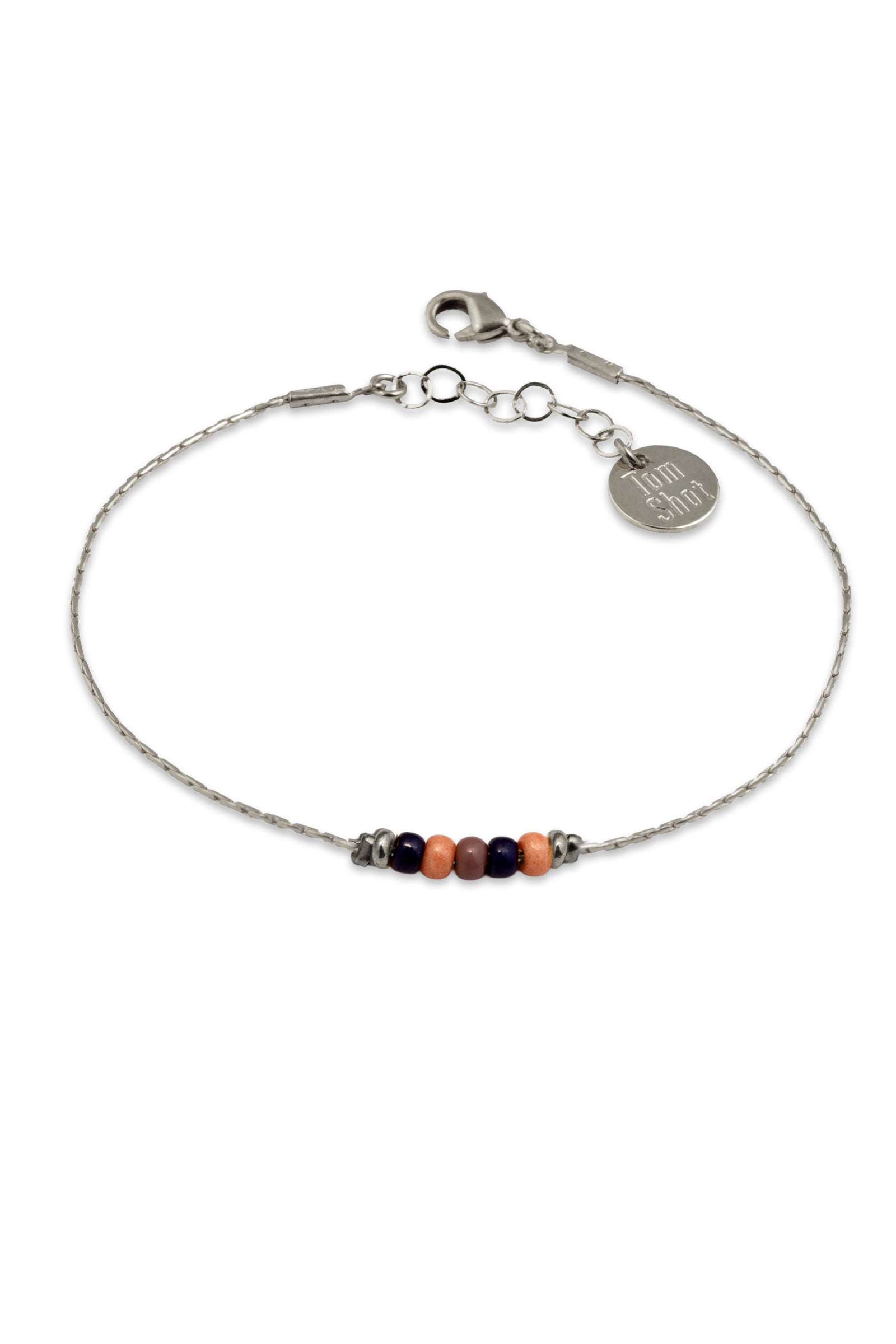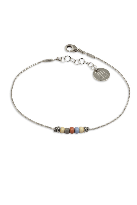 Dieses filigrane Armband besteht aus einer feinen Palomakette, die durch einen mittig fixierten Abschnitt bunter Glasperlchen verziert wird.