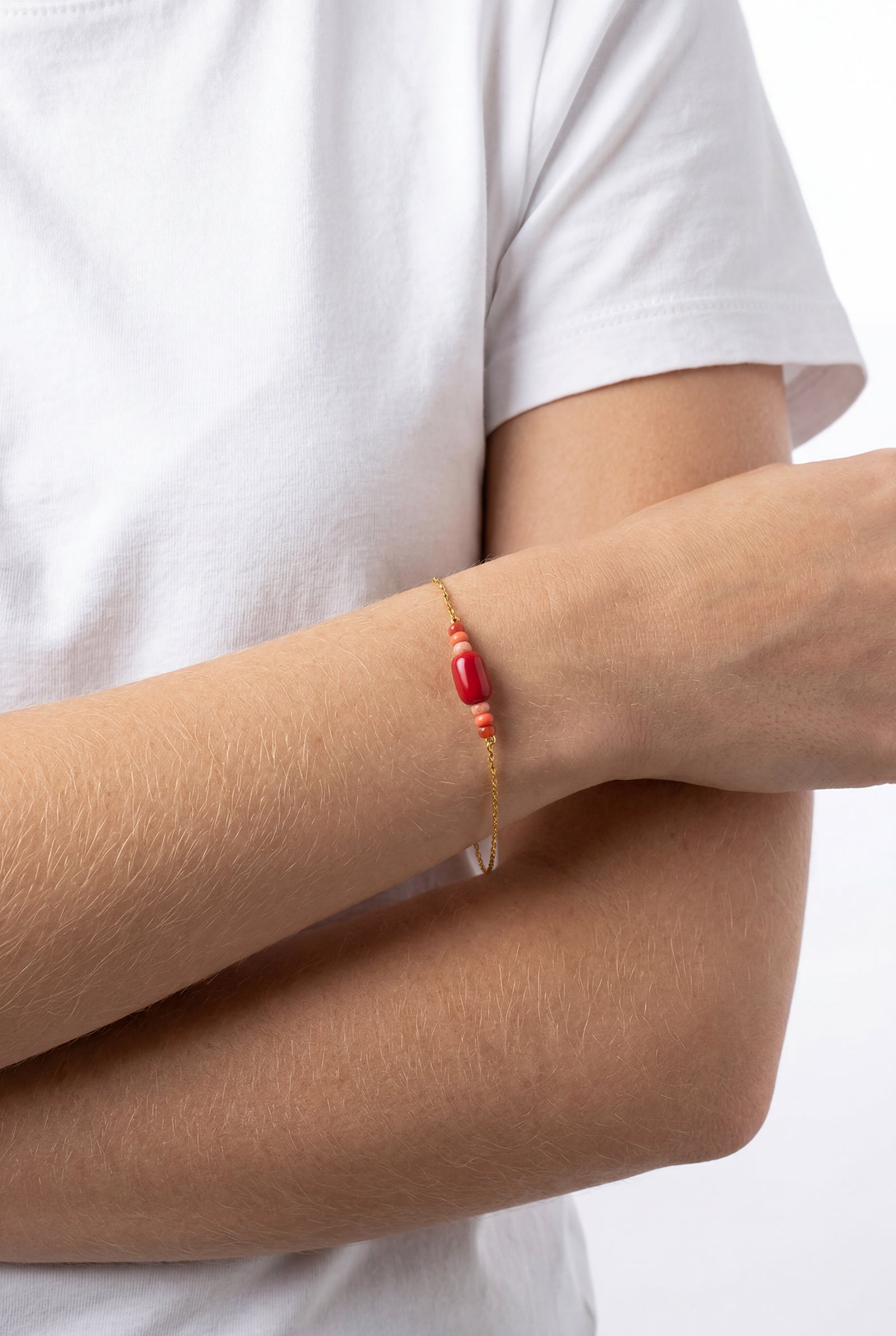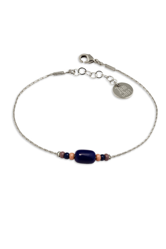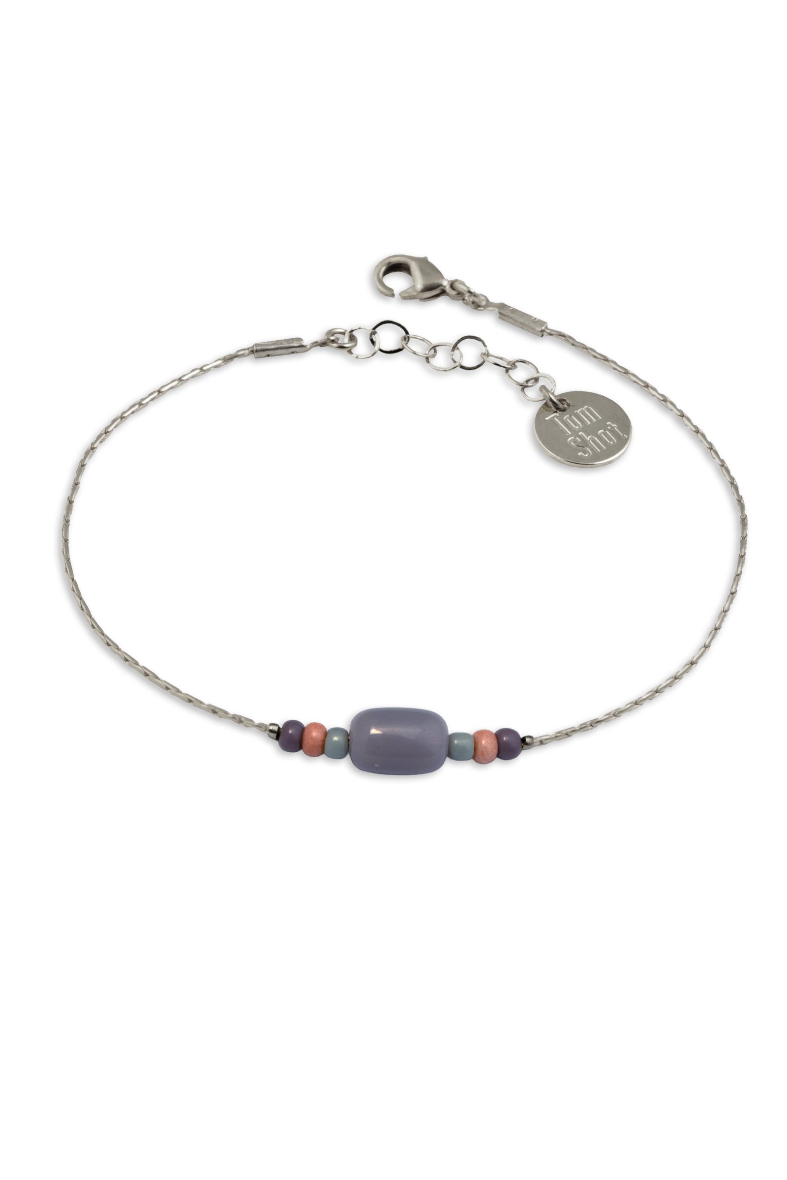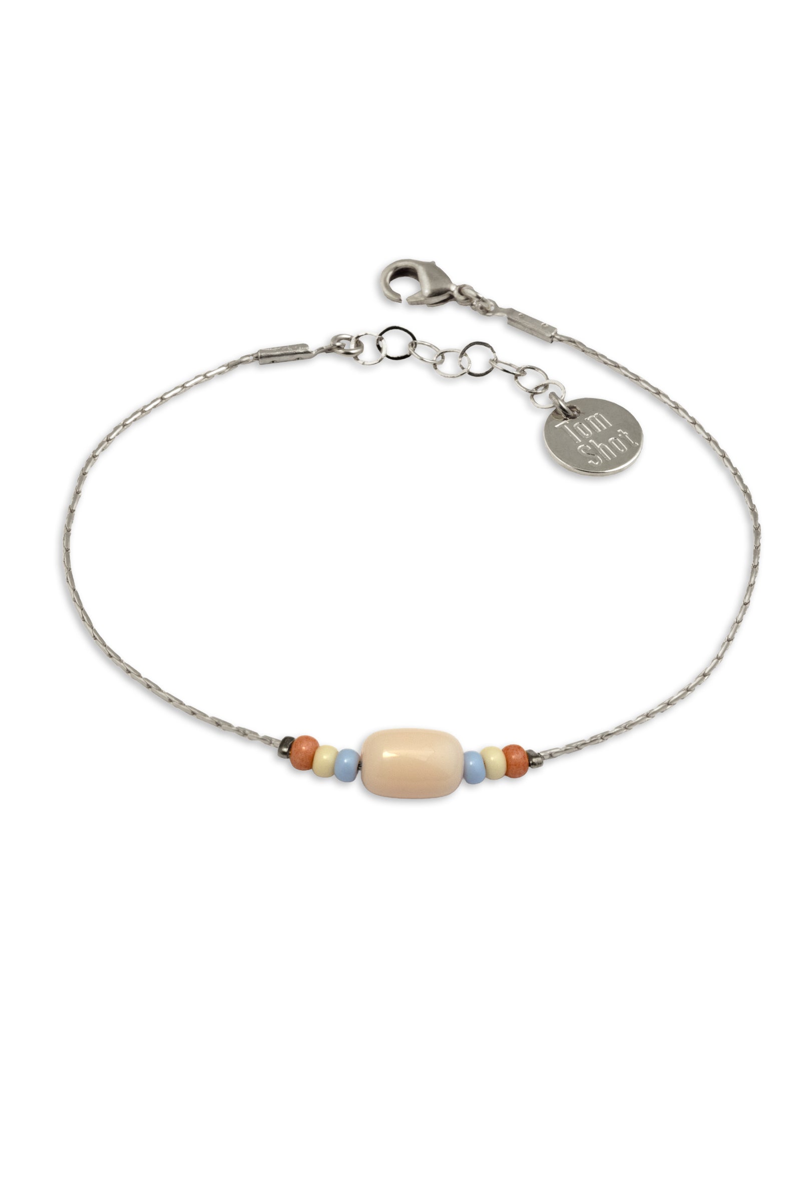 Dieses filigrane Armband besteht aus einer feinen Palomakette, die durch einen mittig fixierten Abschnitt bunter Glasperlchen verziert wird.