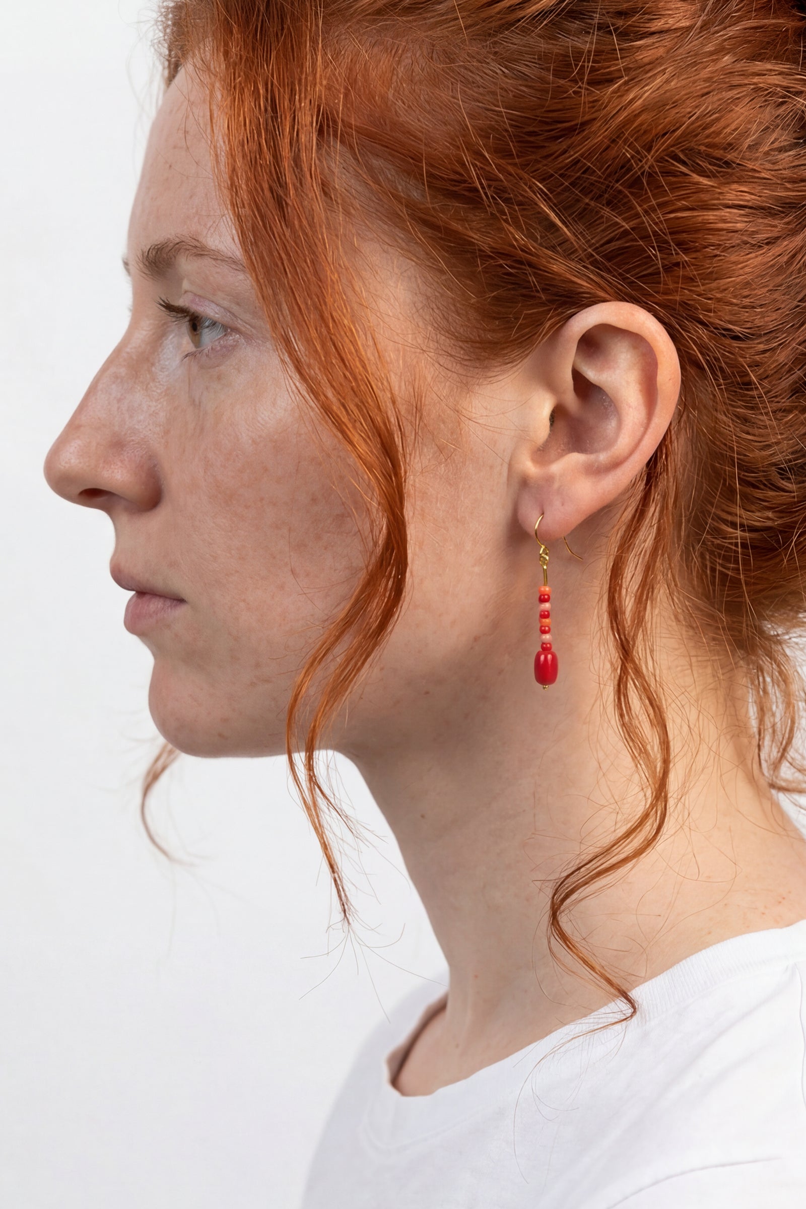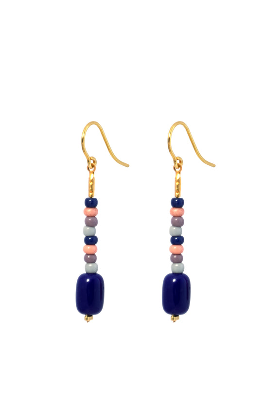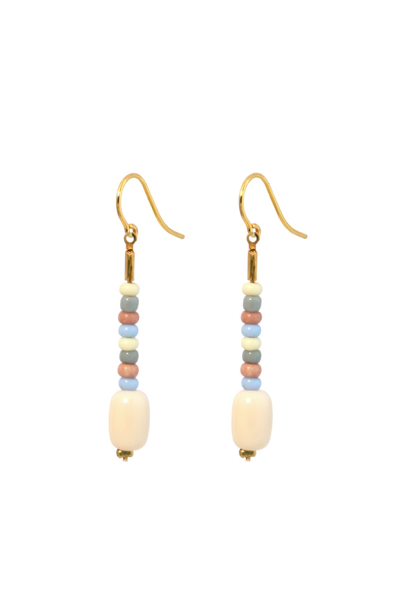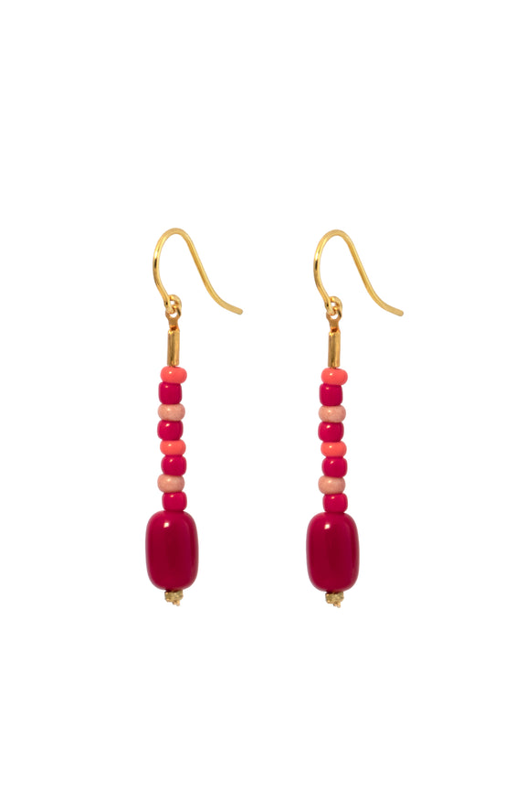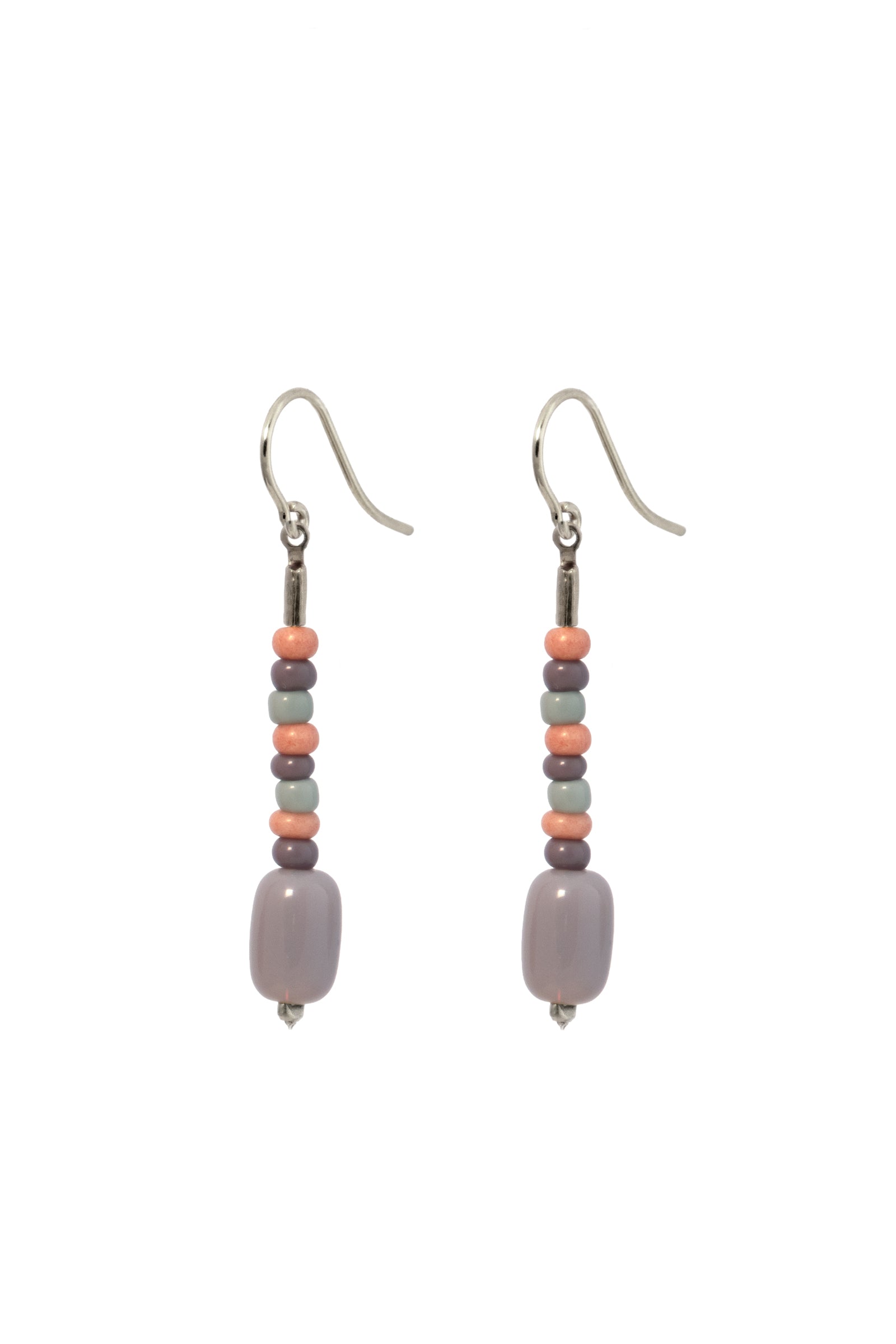 Unsere formschöne Barrelperle ist hier zusammen mit bunten Rocailleperlchen auf einen Abschnitt feiner Palomakette gefädelt, die am Ohrhaken schwingt.