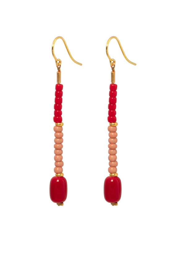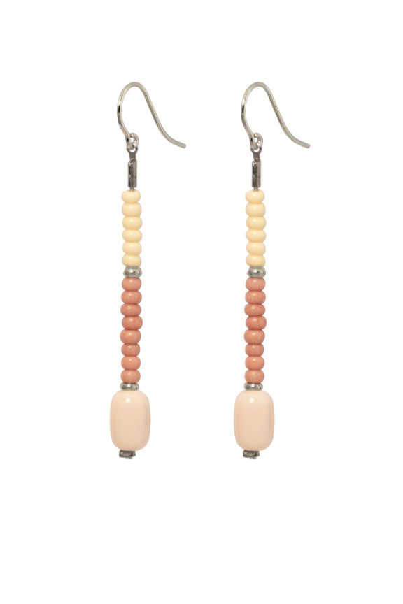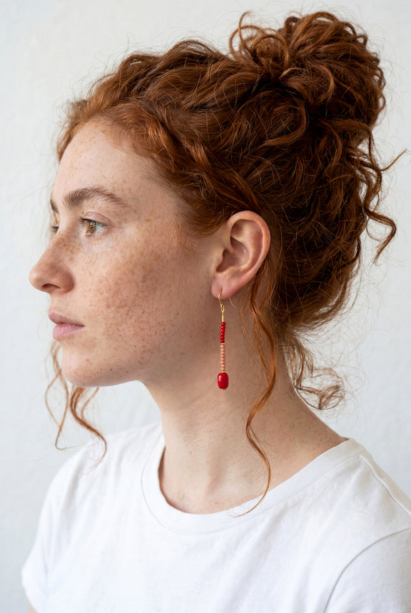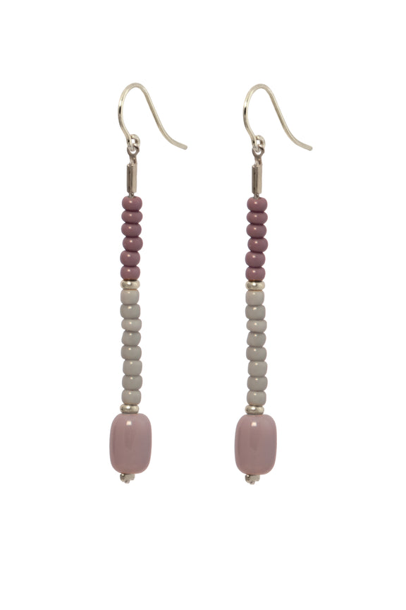 Unsere formschöne Barrelperle ist hier zusammen mit bunten Rocailleperlchen auf einen Abschnitt feiner Palomakette gefädelt, die am Ohrhaken schwingt.
