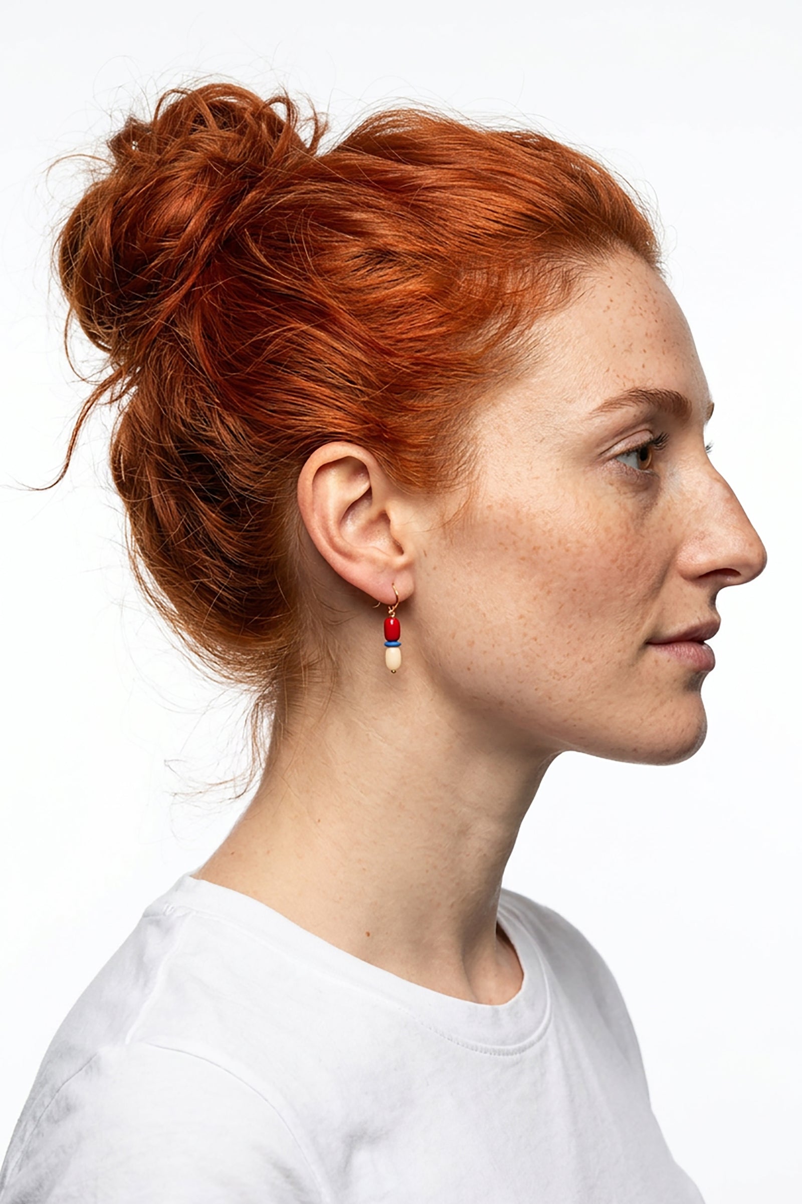 Diesen raffinierten Ohrring bieten wir in drei ungewöhnlichen Farbklängen an. Die Anordnung der Perlen ist beim linken Ohrring genau umgekehrt zu der beim rechten.