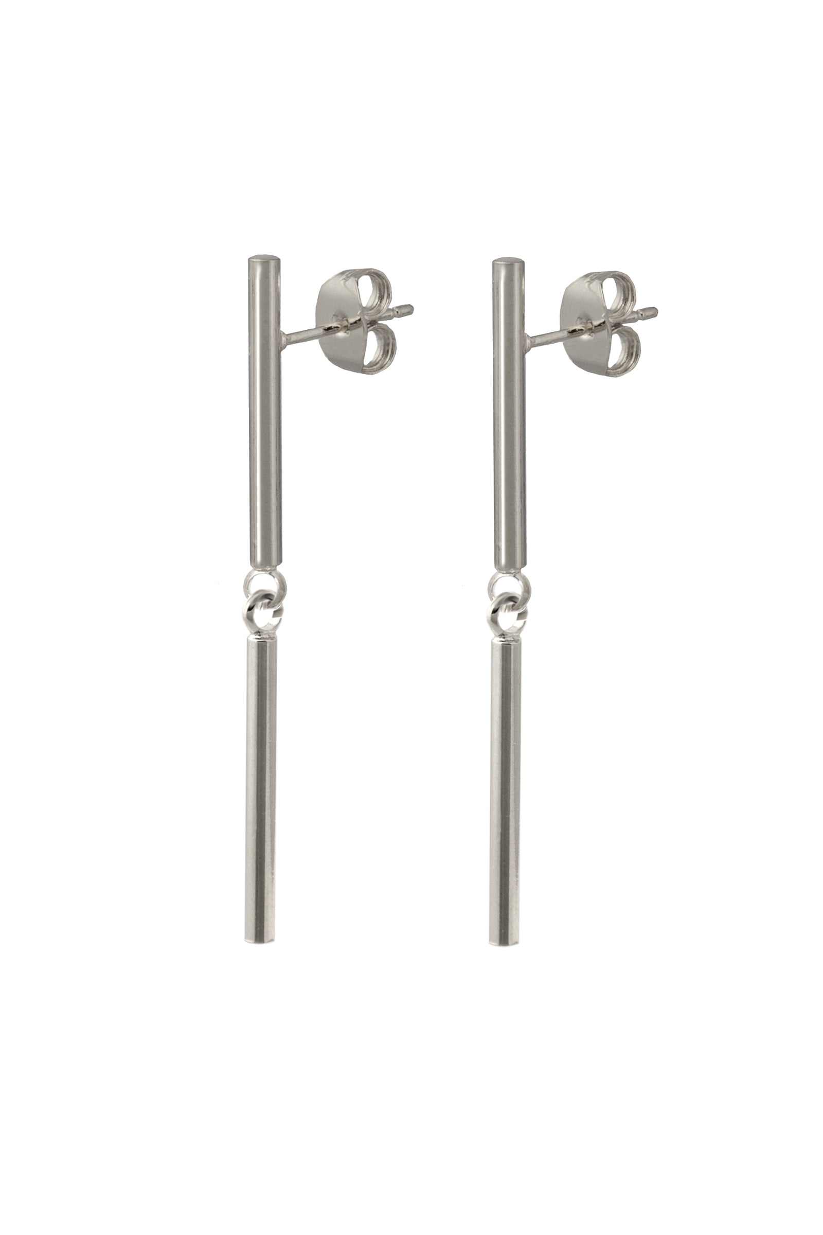 Eins unserer gradlinigsten Modelle besteht aus zwei runden Metallstäbchen von je 2 cm Länge, die ineinander gehängt sind. Am oberen ist der Ohrstecker direkt angelötet, das untere schwingt frei.