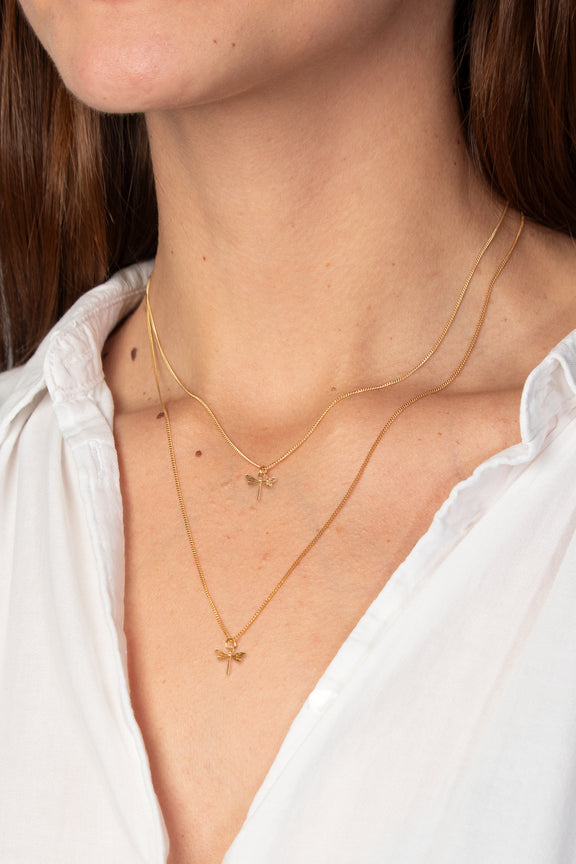 Die feine, facettierte Panzerkette schmiegt sich sanft um den Hals und schimmert dezent im Licht.